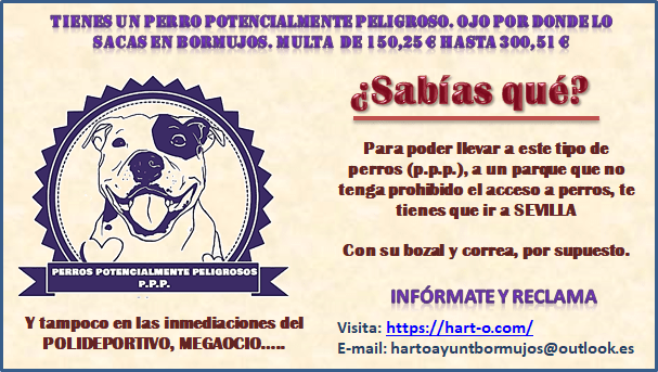 - Y otro respecto, a las prohibiciones de circulación y permanencia de estos animales dentro del municipio, no permitiéndose ni entrar en parques, y restringiéndose el acceso por determinadas vías públicas de este municipio, en un horario bastante abusivo de 07:00 a 22:00 horas. En Andalucía se determinó que pueden permanecer y circular por todas las vías y espacios públicos, con las limitaciones que dicten a ese respecto a los animales de compañía. Se matiza que el perro si o si, debe de llevar bozal y estar sujeto con cadena, en caso contrario multa de 300,52 hasta 2.404,05 euros.