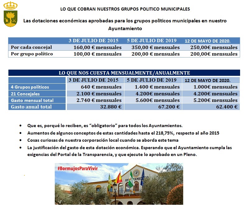 Los Ayuntamientos podrán asignar a los grupos políticos municipales una dotación económica para su funcionamiento. Nuestro Ayuntamiento así lo hace, aunque esto no es obligatorio. Aquí, salvo algún error, podrán ver esas cantidades, y comprobarlas en los enlaces, los aumentos en esas dotaciones, los gastos anules y algunos casos curiosos relacionados con esta asignación económica.